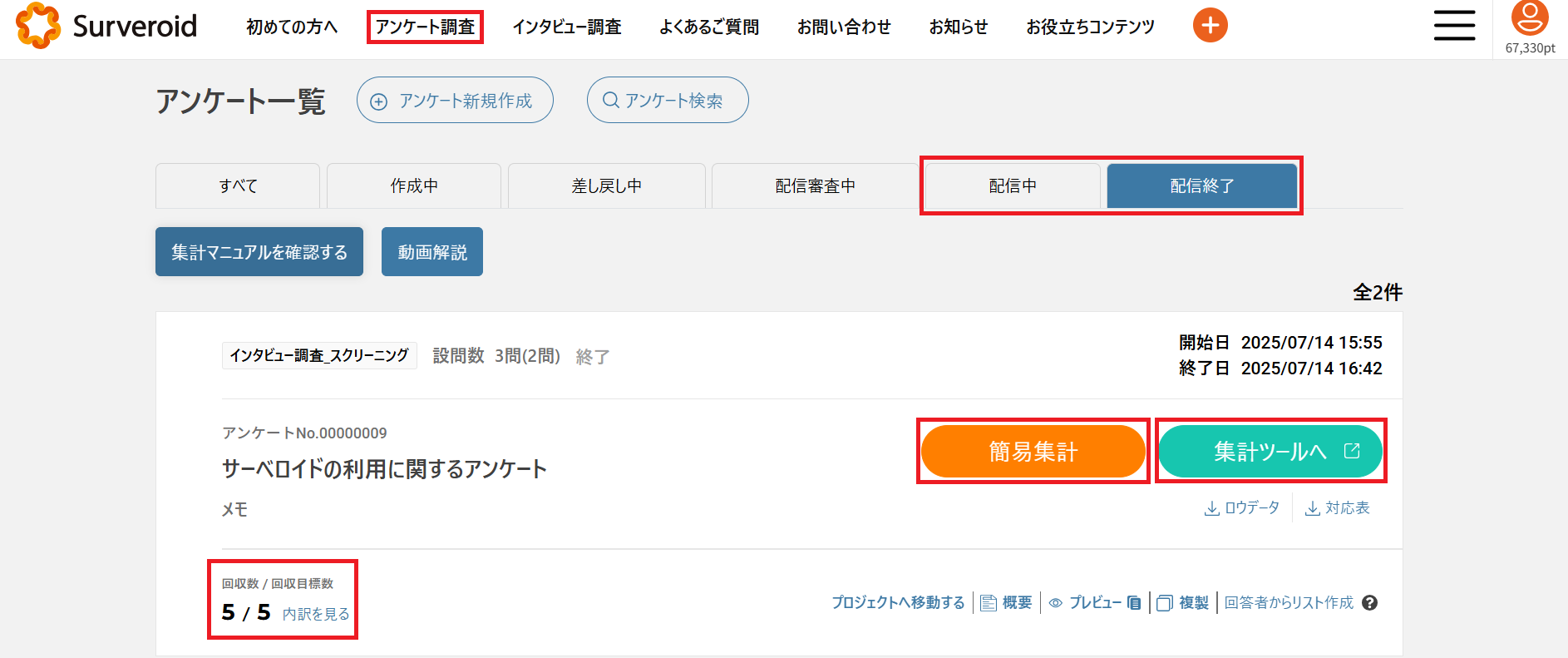 アンケートを配信するとログイン後ページ上部の「アンケート調査」ページの「配信中」もしくは「配信終了」のタブに対象のアンケートが表示されます。
