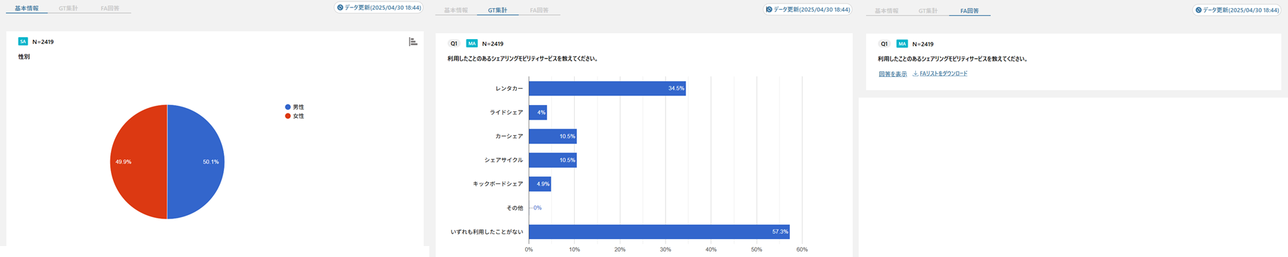 ・「基本情報」 「GT集計」 「FA回答」の3つのタブ構成