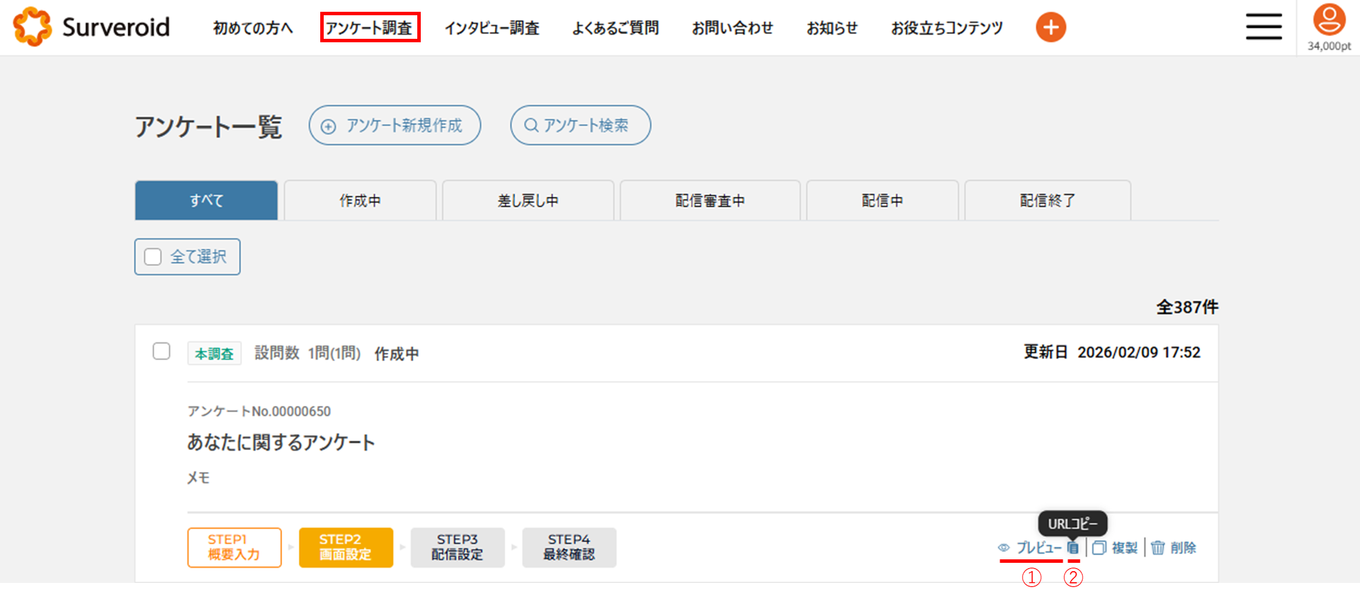 【アンケート一覧】の該当アンケート右下「プレビュー」(上記画像内①)より確認いただけます。