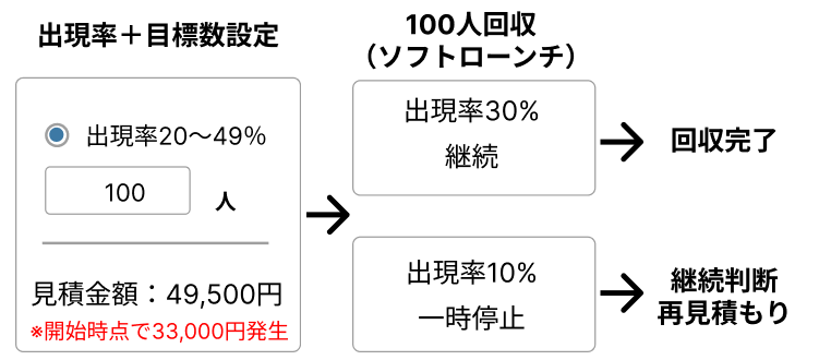 1セル50~100人を回収した時点で一時停止し出現率を確認します。(今後「ソフトローンチ」と呼びます。)