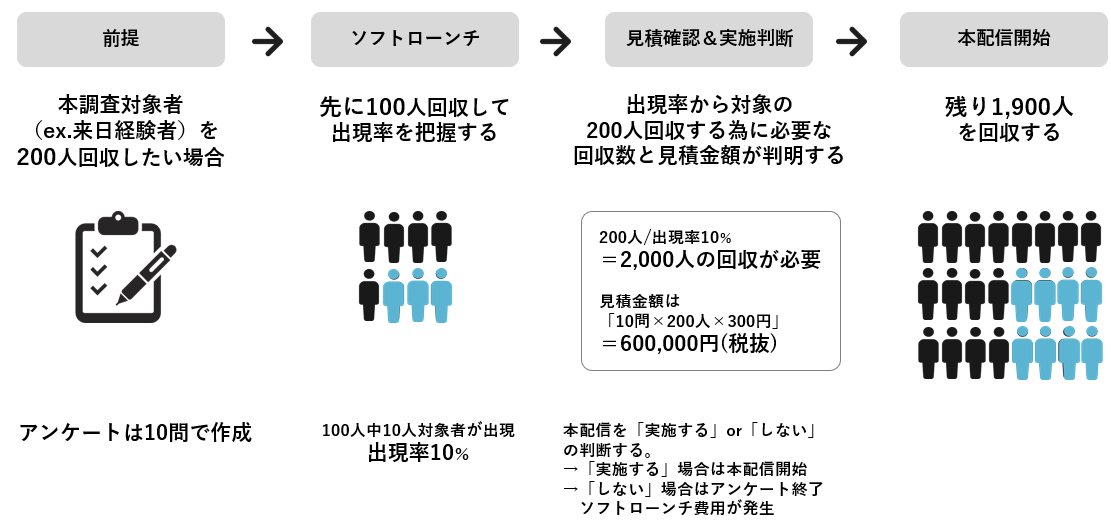 ※本配信に進んだ場合、本配信費用(本調査回収数×設問数×単価)がソフトローンチ費用を下回った場合はソフトローンチ費用が適用されます。