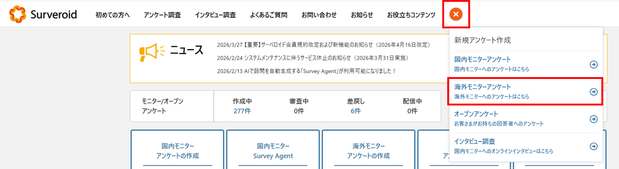 」より、「海外モニターアンケート」をクリックし、作成を開始いただけます。