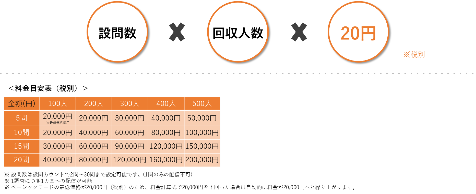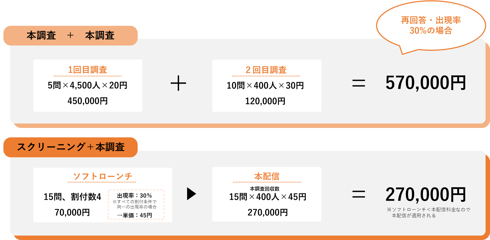 ※下記は料金の一例です。再回答率・出現率によって価格は「2段階調査(本調査+本調査)」<「スクリーニング+本調査」にもなりえます。