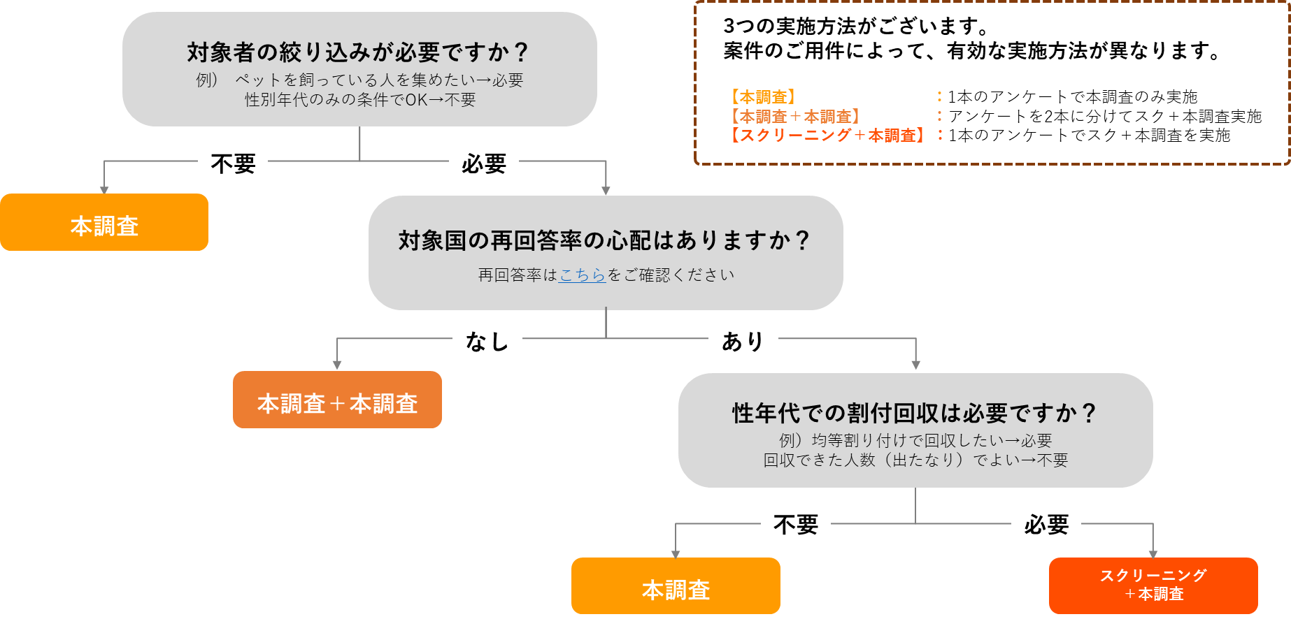 実施したい調査のご用件によって適した実施方法が異なります。