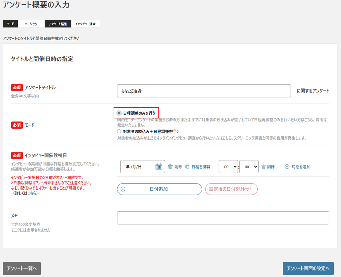 アンケートタイトル・インタビュー開催候補日を設定し、アンケート画面の設定に進んでください。