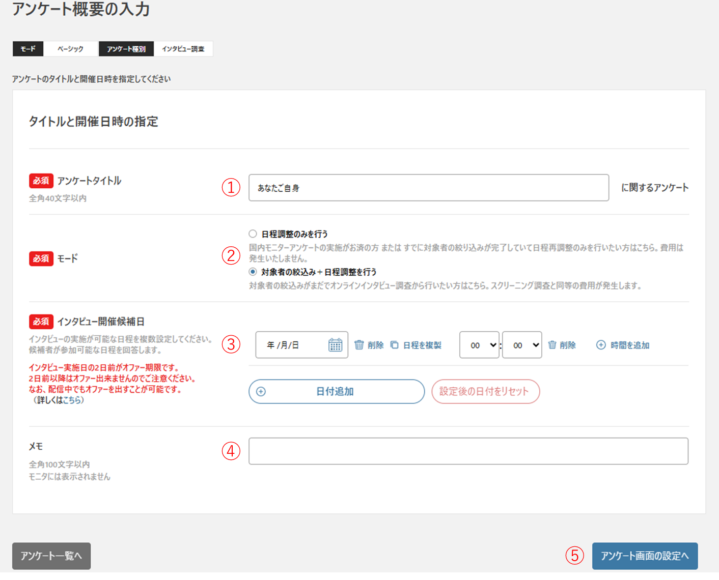 候補日を増やしたい場合は、スクリーニングのモード「日程調整のみを行う」から候補日程を増やし、