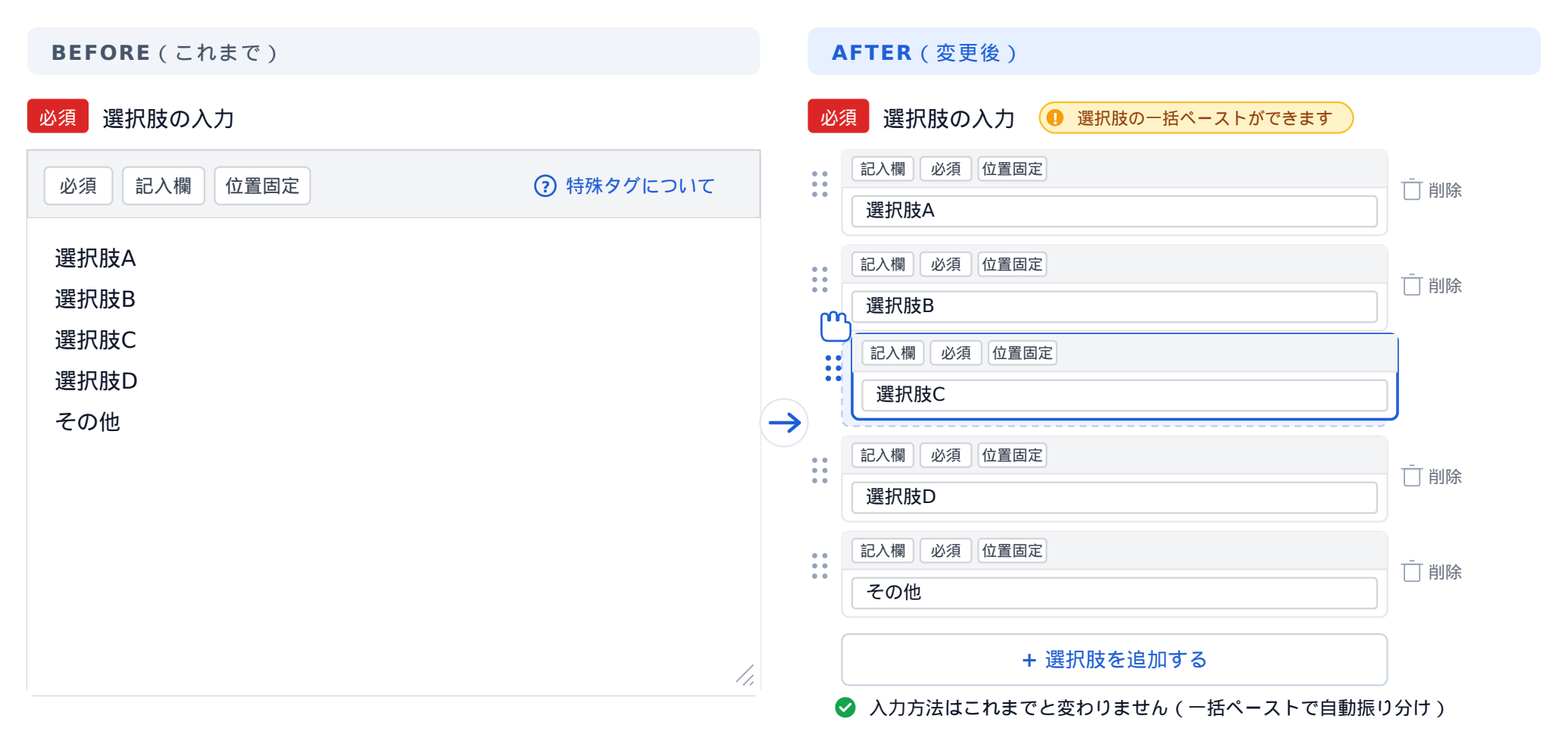 これまで選択肢は、1つの入力欄に改行区切りで入力・表示する形式でしたが、