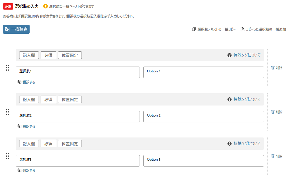 翻訳元に入力した選択肢を、ボタンひとつで現地語へ一括翻訳できる機能です。