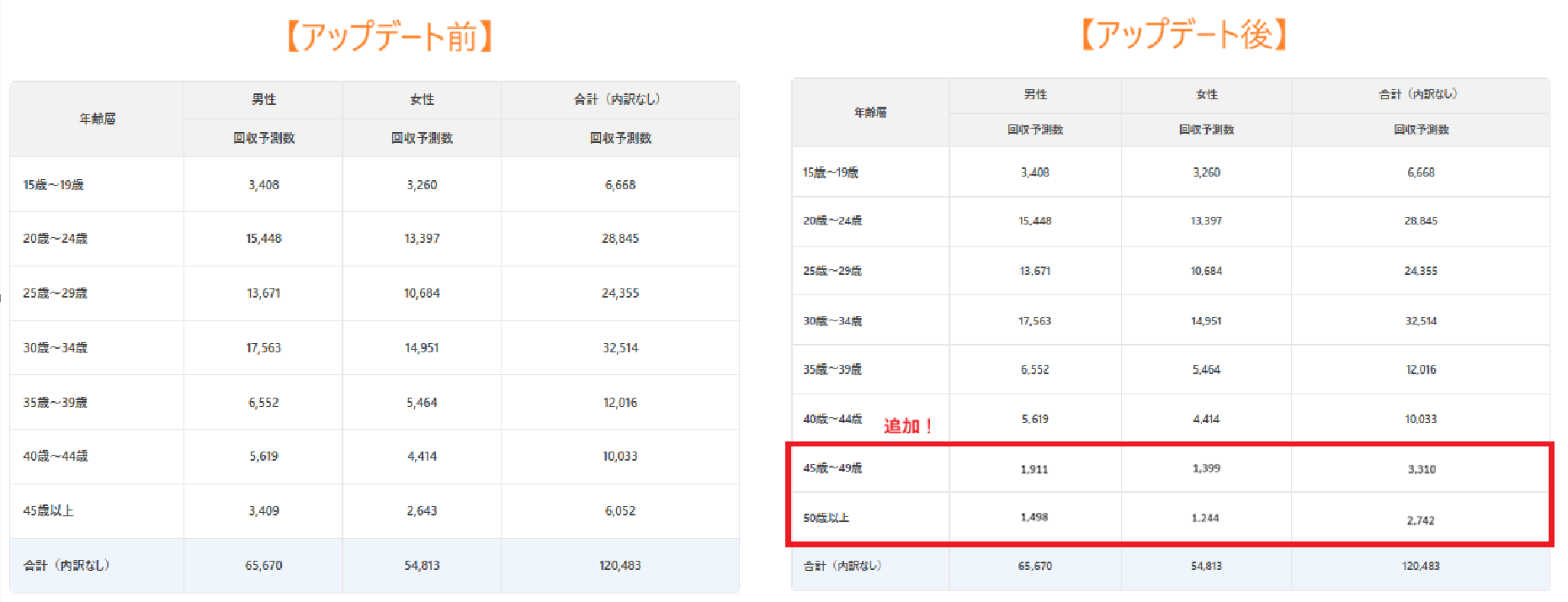 これまで、性年代の割付は「45歳以上」が上限となっておりましたが、「45歳〜49歳」「50歳以上」が追加され割付設定が可能になりました。