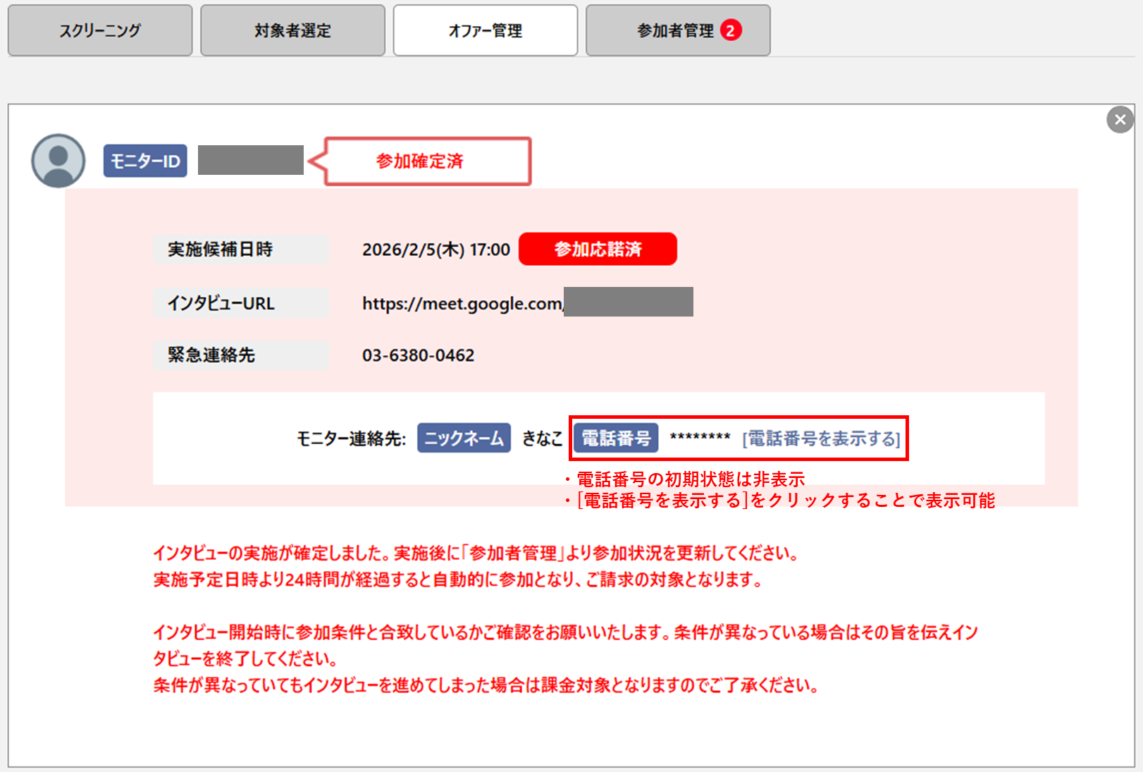 「オファー管理」タブに表示される対象者の電話番号は、初期状態では非表示となります。