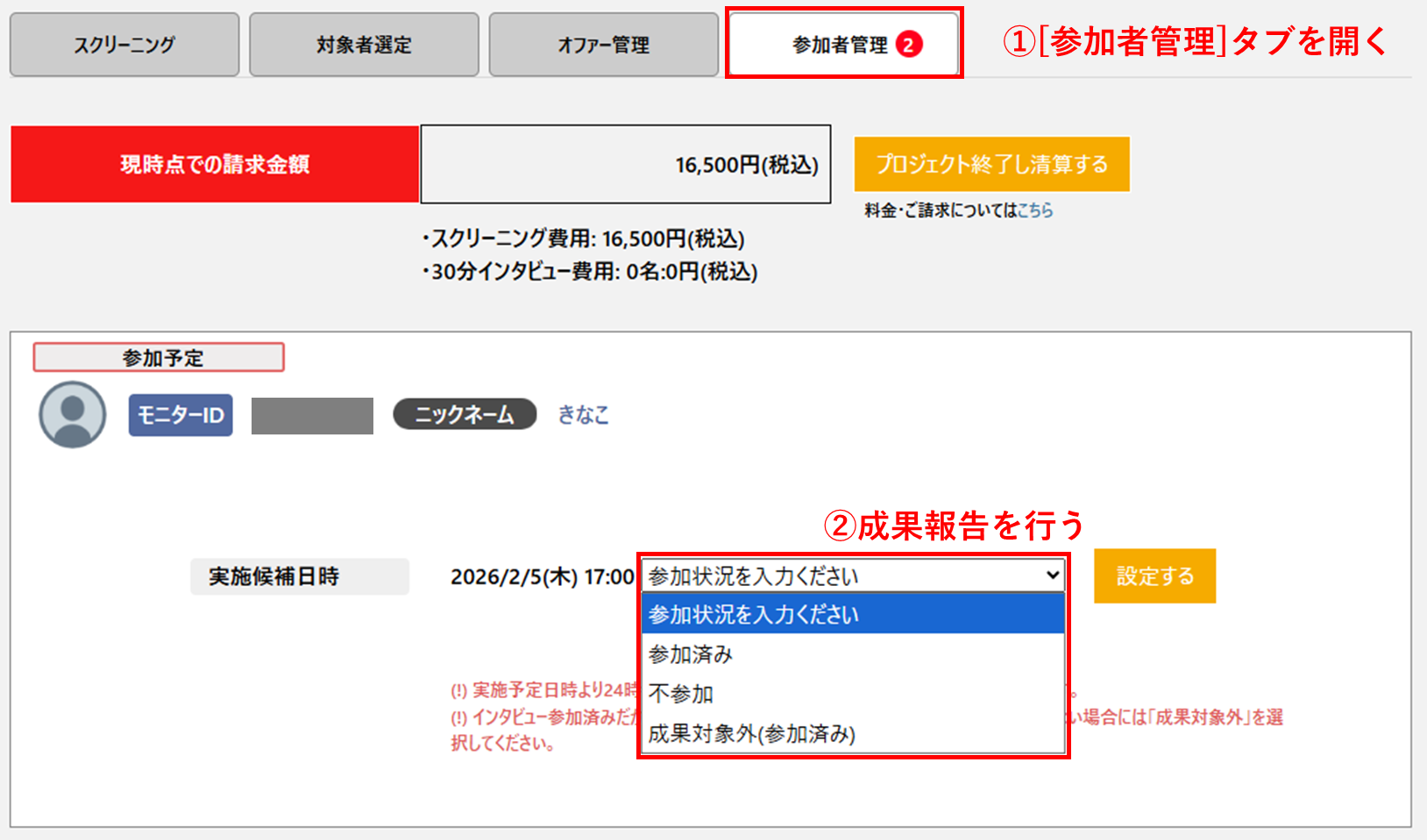 インタビューの実施後24時間以内に①「参加者管理」より参加状況を更新してください。