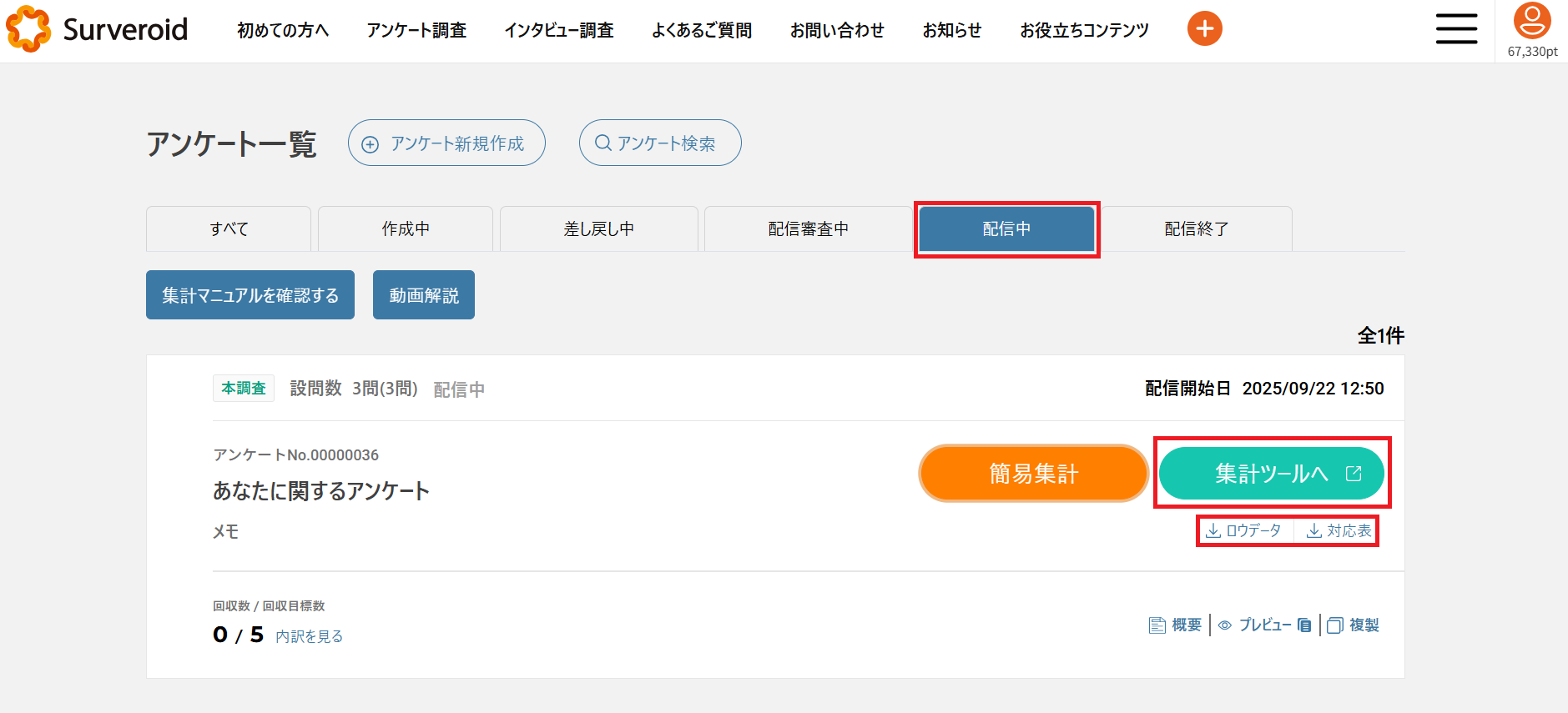 アンケート調査>[配信中]ステータス内にある該当アンケートの「集計ツールへ」を押下すると集計ツールに遷移し、集計表のダウンロードが可能です。