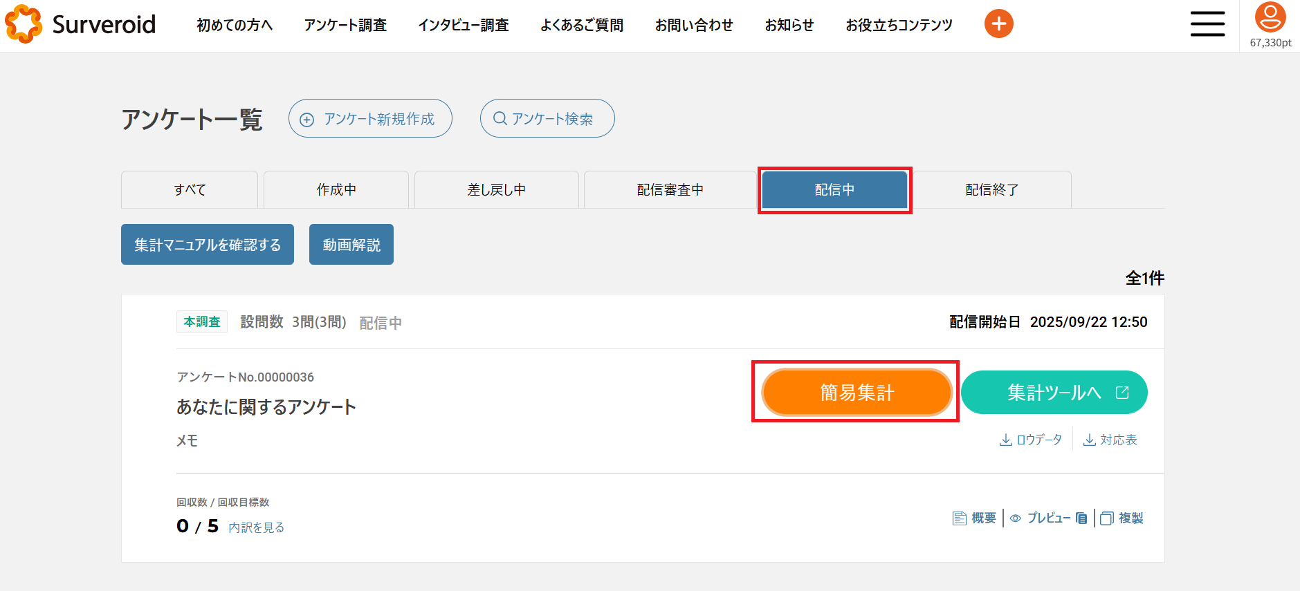 アンケート調査>[配信中]ステータス内にある該当アンケートの「簡易集計」を押下すると、