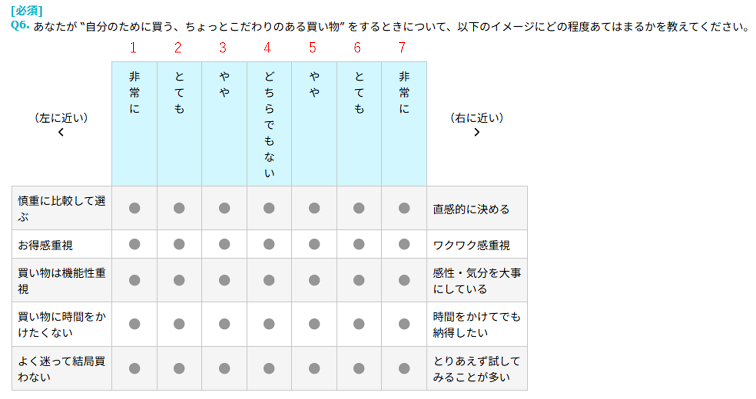 下記のように、各項目ごとに「どちら寄りか」を選択する設問の場合、