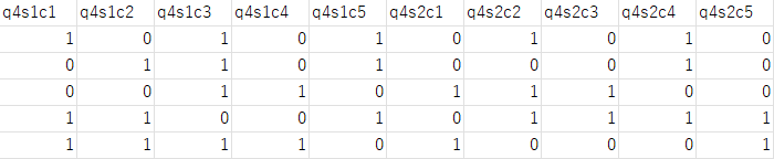マトリクス複数回答(マトリクスマルチ/MTM) | 設問番号 + s + 行番号 + c + 選択肢番号(列番号) | 0 or 1 | q1s1c1 |