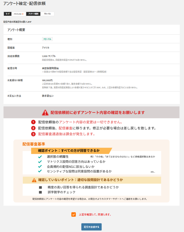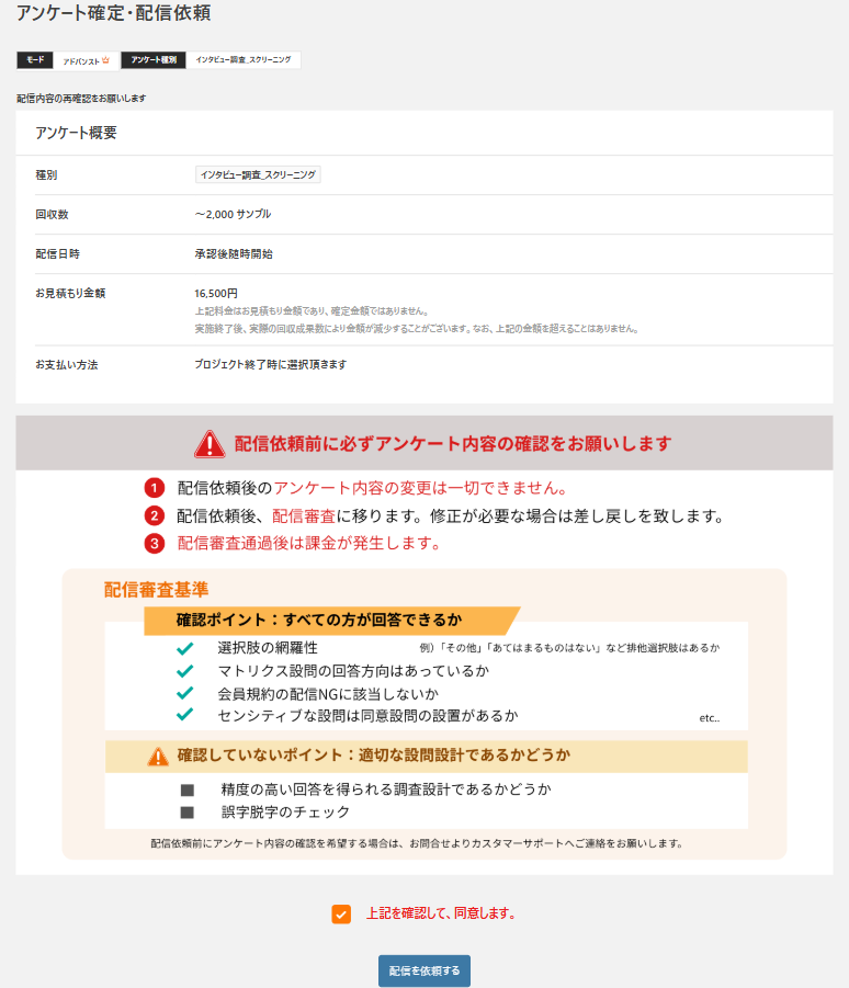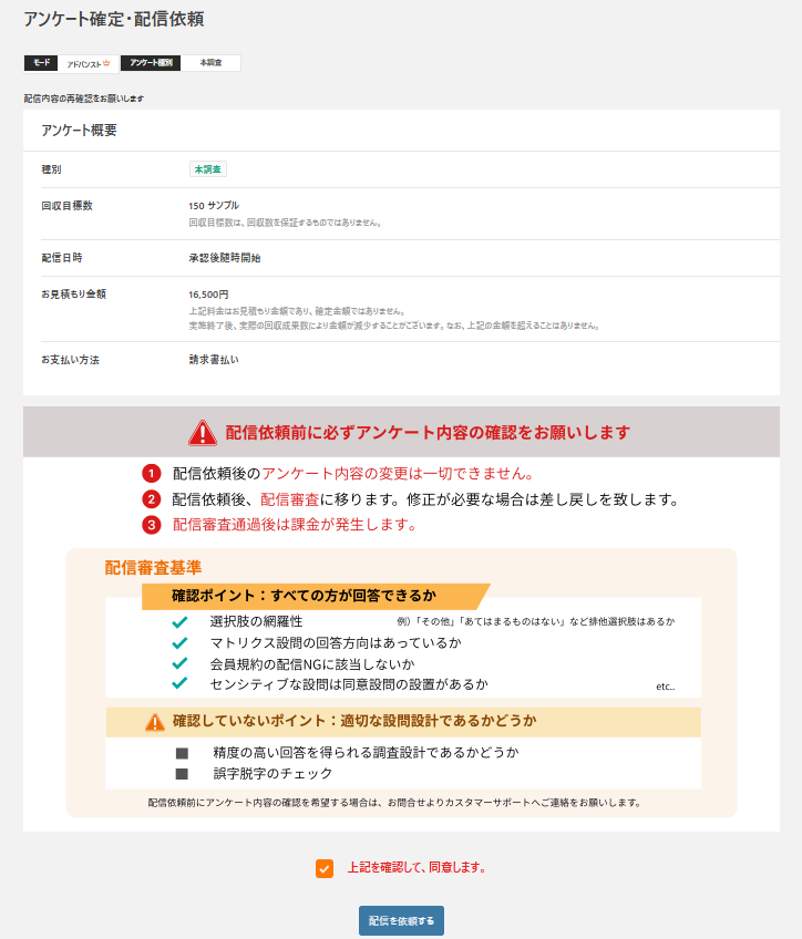 最終確認が完了したら「確定・配信依頼へ」ボタンを押してアンケートを確定させます。