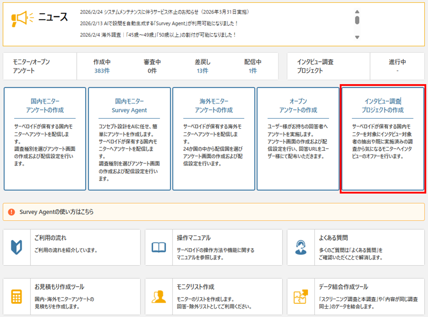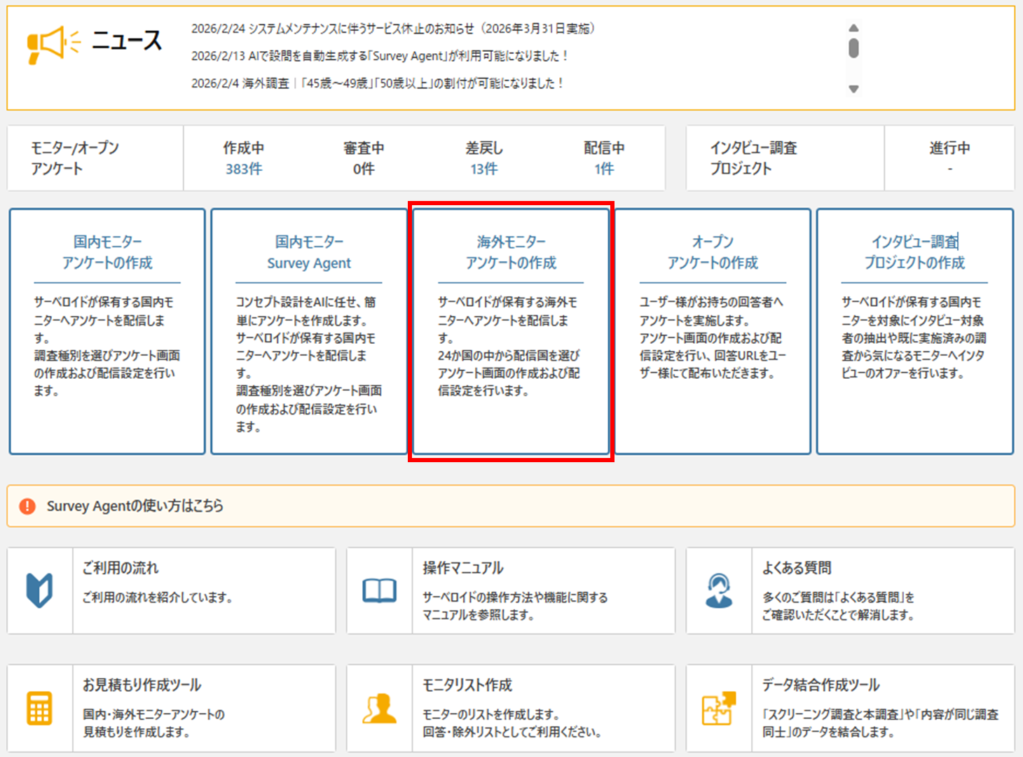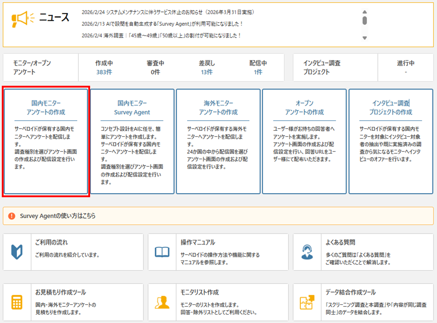 サーベロイドにログイン後、画面左側の「国内モニターアンケートの作成」をクリックします。