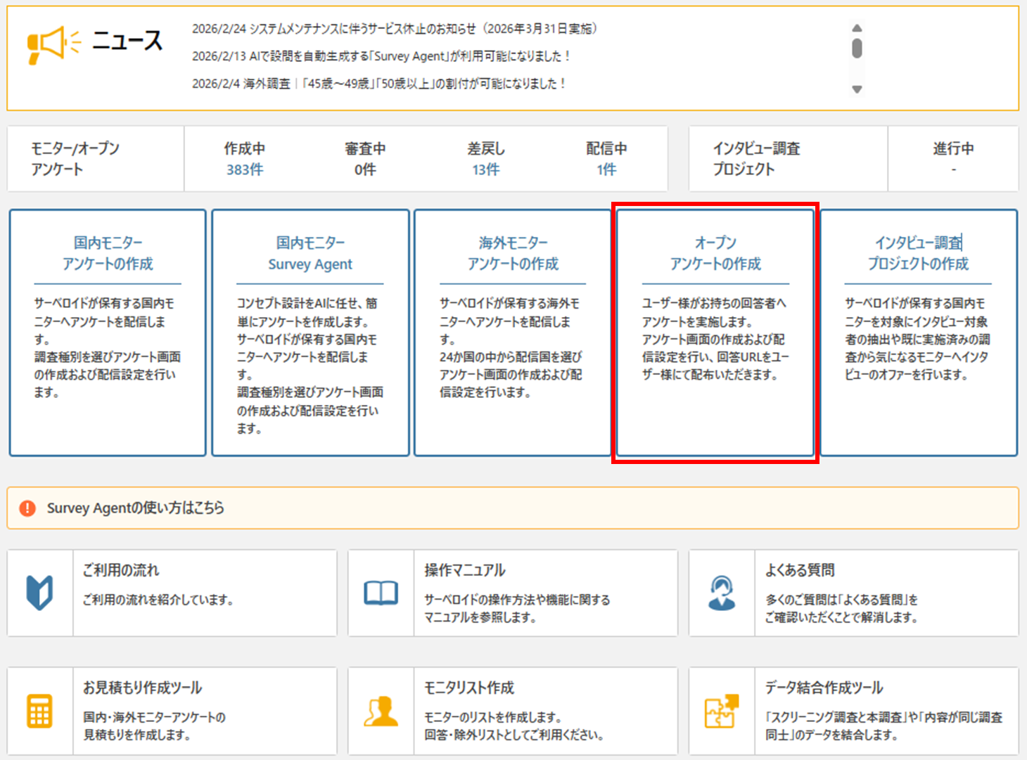 サーベロイドにログイン後、画面左側の「オープンアンケートの作成」をクリックします。